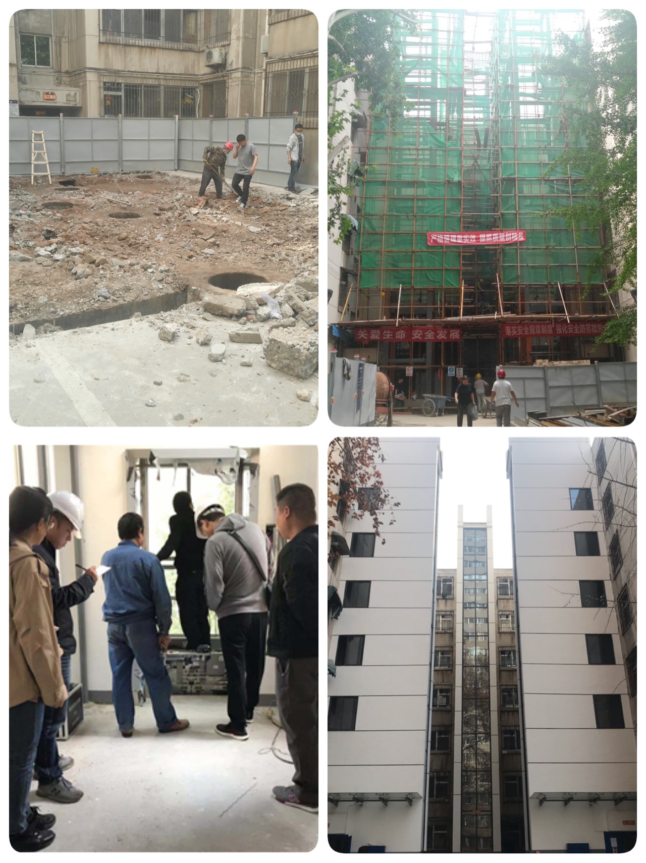 9号楼住宅楼加装电梯施工是一项系统工程,历时7个多月。施工过程克服了天然气、雨污水、电力电缆等各类管线整改迁移等诸多困难,完成基础施工;合理安排、错避雨季,有序完成底坑混凝土浇筑、钢结构吊装安装等主体结构施工;及时完成电梯设备安装手续报备、电梯调试等安装工作;同步完成楼梯间步道粉刷、墙体外立面清洗等居住环境提升改造。
