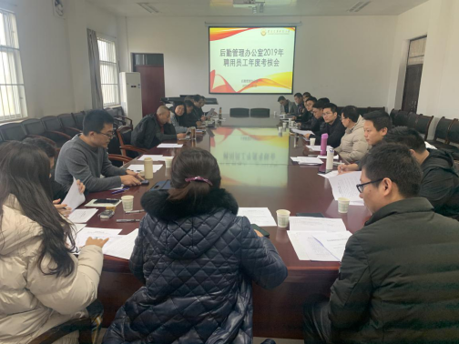 1月7日至8日,总务处组织召开聘用人员2019年度考核工作会,考核分两校区进行,总务处处长卜长安,副处长张龙、刘虹、刘永恒,各科室负责人及全体聘用人员参加考核。