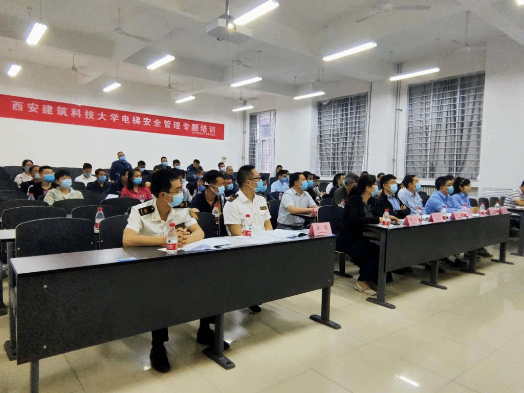 本次活动共分为两个阶段,第一阶段为电梯安全管理培训。培训前,质监高新分局局长胡楷在会议讲话中对我校特种设备安全管理工作表示肯定,同时,要求各高校需要高度重视电梯管理工作,确保校园安全和师生生命财产安全。随后,西安特种设备检验检测院韩园园副部长分别从电梯安装、注册、使用等要求,电梯日常管理,电梯运行原理及特种设备平台的使用管理等四个方面进行电梯安全管理专项培训。