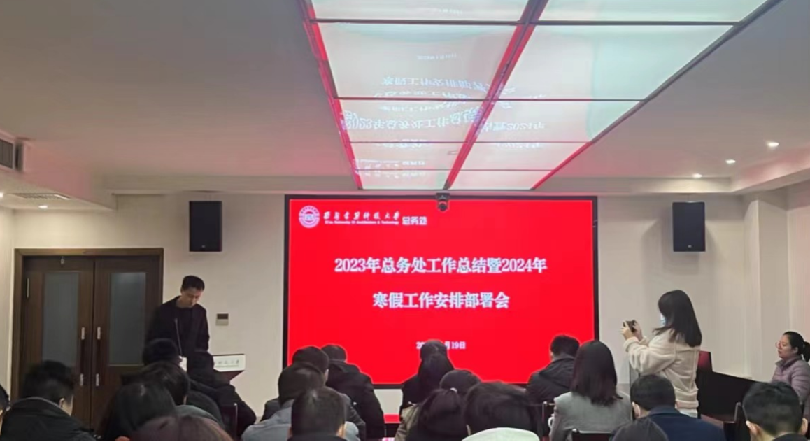 处长闫清波全面、科学、细致的总结了2023年总务处主要工作;重点介绍了完整社区建设、校园水系恢复、学校环境提升、重大活动保障、智慧化配电室建设和民生幸福工程等亮点工作;系统分析了我们工作中存在的不足;传达了学校2023年总结会会议精神,并对寒假工作进行了安排部署。
