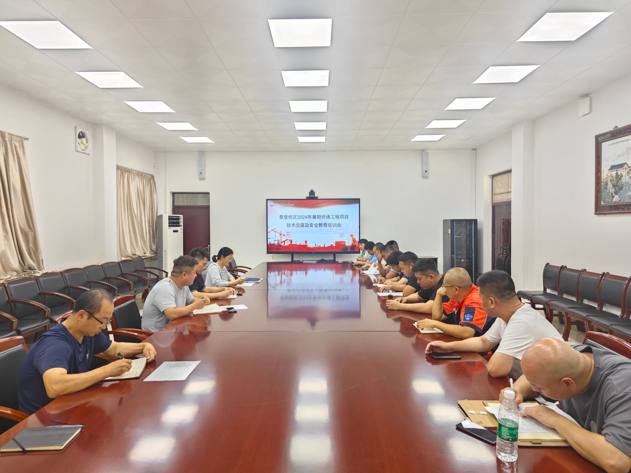 7月22日上午,后勤管理办公室在综合楼一层会议室组织召开草堂校区2024年暑期修缮工程项目技术交底暨安全教育培训会,会议由后勤管理办公室负责人赵欣悦主持。总务处副处长杜玉峰、后勤管理办公室工程中心相关人员、各施工单位项目负责人参会。