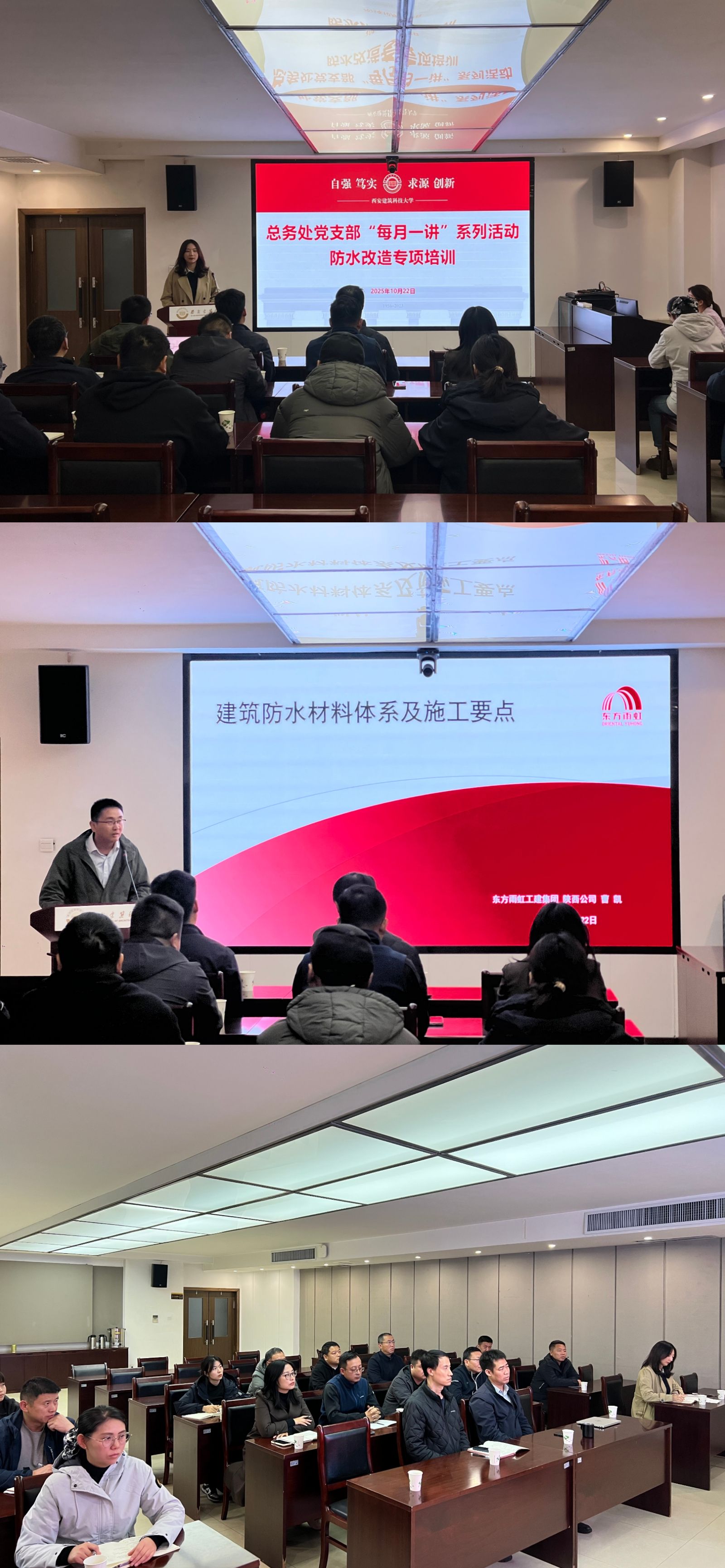 2025年10月22日下午,修缮科在行政楼负一层会议室组织召开总务处党支部“每月一讲”系列活动之—防水维修专题培训会。总务处副处长杜玉峰、王运思出席会议,两校区修缮班组、质管科、安全与综合办公室相关人员及入围防水单位代表共同参会。