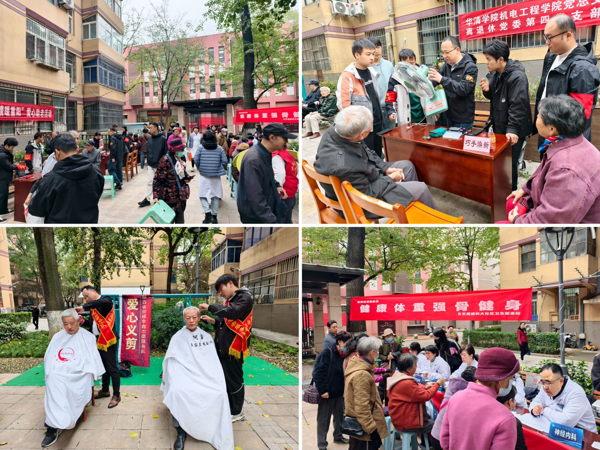 退休办门口则聚焦于健康与精细服务,电器修理、爱心义诊、义剪摊位前围满了居民, 构成了一个温馨便民的服务圈。