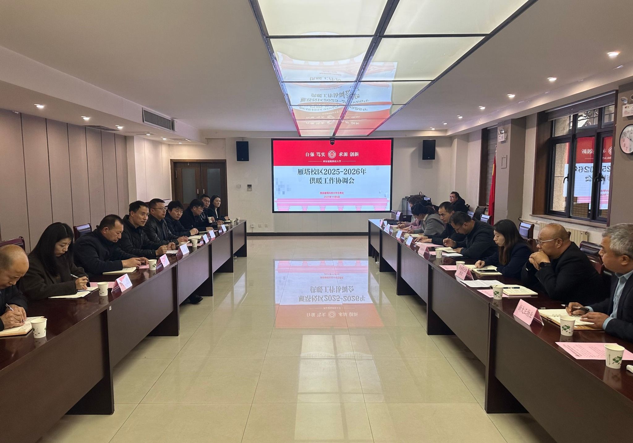 为切实做好2025-2026年度冬季供暖保障工作,11月6日下午,总务处在行政楼负一楼会议室组织召开了雁塔校区今冬供暖工作协调会。学生工作部(处)、附属学校、离退休工作办公室、后勤服务中心、各物业服务单位负责人及供暖工作相关人员参会,西安雁东供热有限公司相关负责人受邀参加会议。会议由总务处副处长王运思主持。