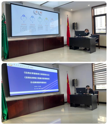 吉华简要介绍了总务处处内招标采购和修缮工程管理是总务处的重点业务,也是党风廉政风险防范的重要领域,本次培训会重点对两项业务的相关办法进行解读及延伸,以期指导工作实践,提高工作效率及管理水平。招标采购管理人员陈琳详细解读了《总务处采购实施办法》、《总务处材料采购、零星维修及修缮工程审批签字管理规定》,梳理了相关工作流程、整理了重点环节要求,使大家在工作中有思路、有章法。零星维修工程结算审核人员贾瑶结合工作实际,从《总务处零星维修工程管理办法》、《总务处修缮工程廉洁管理制度》的框架、重点条款、业务流程、注意事项等方面进行解读。对零星维修工程委派、验收、结算审核及付款等重点环节的“四化”落地及廉政风险防范提出了实操方法。